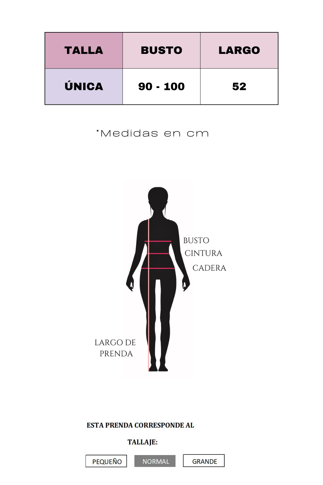 NOTA: esta prenda es de alta comprensión y se expande hasta un 15% de las medidas en la tabla.